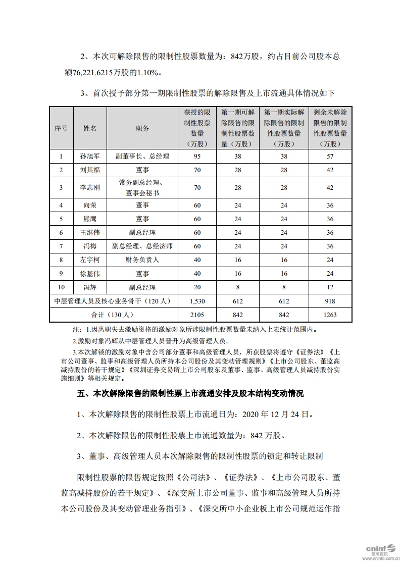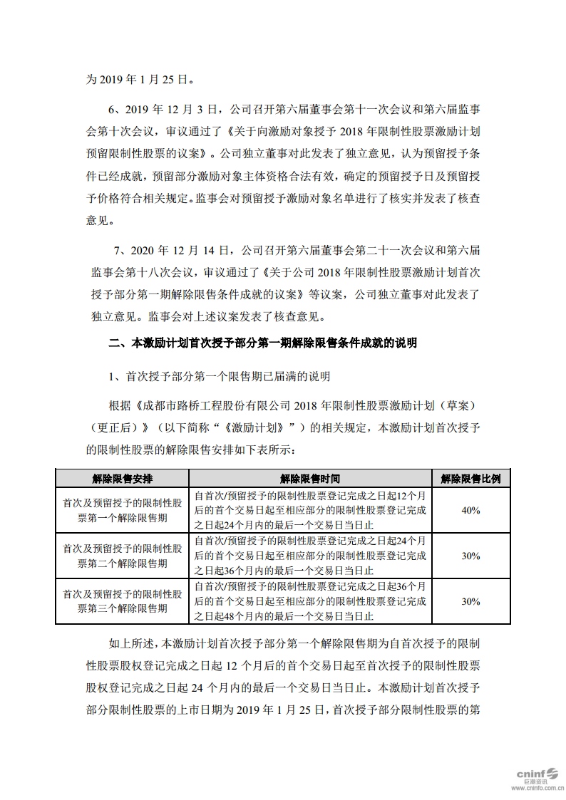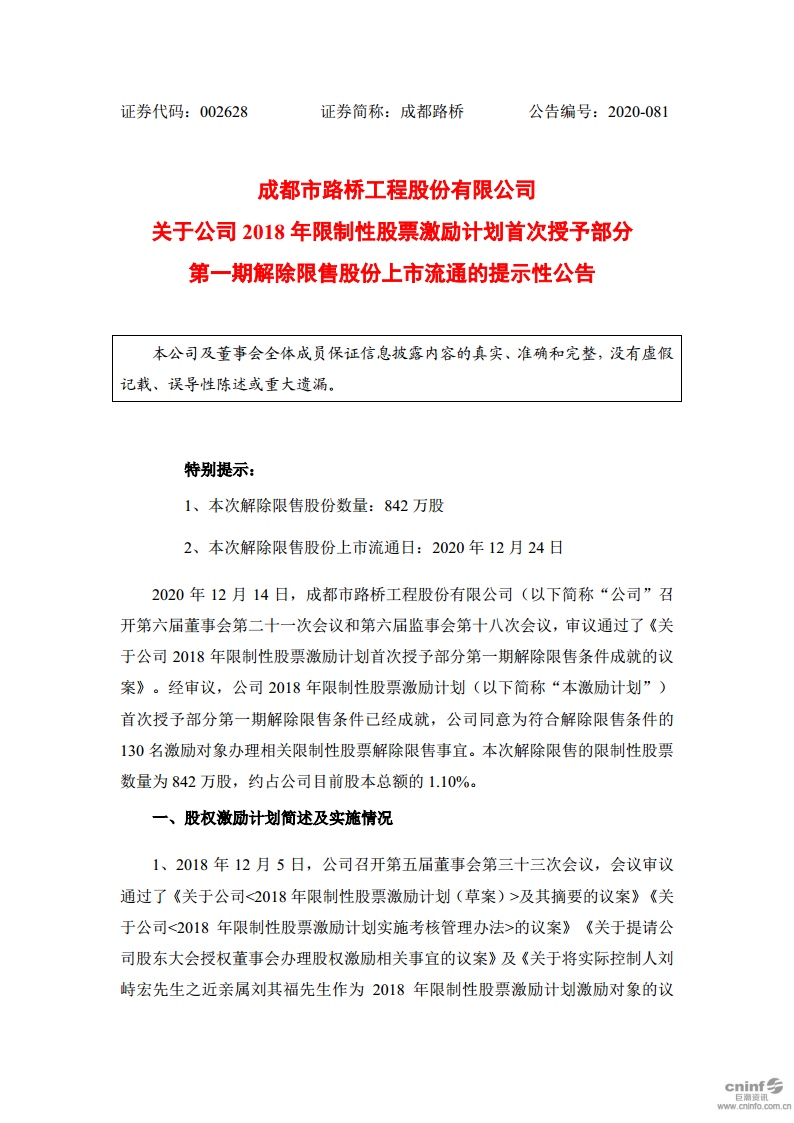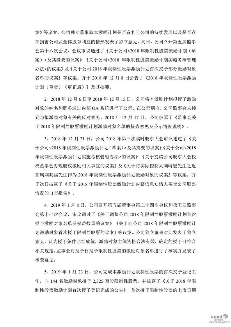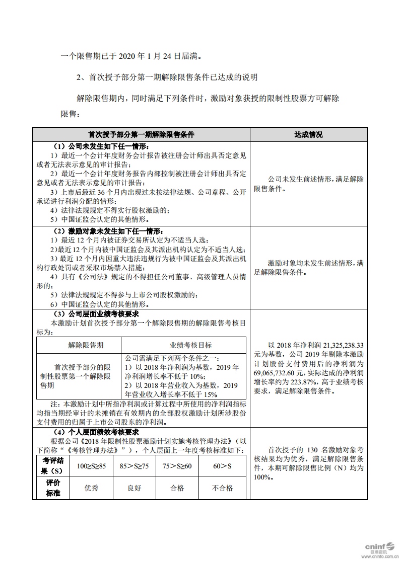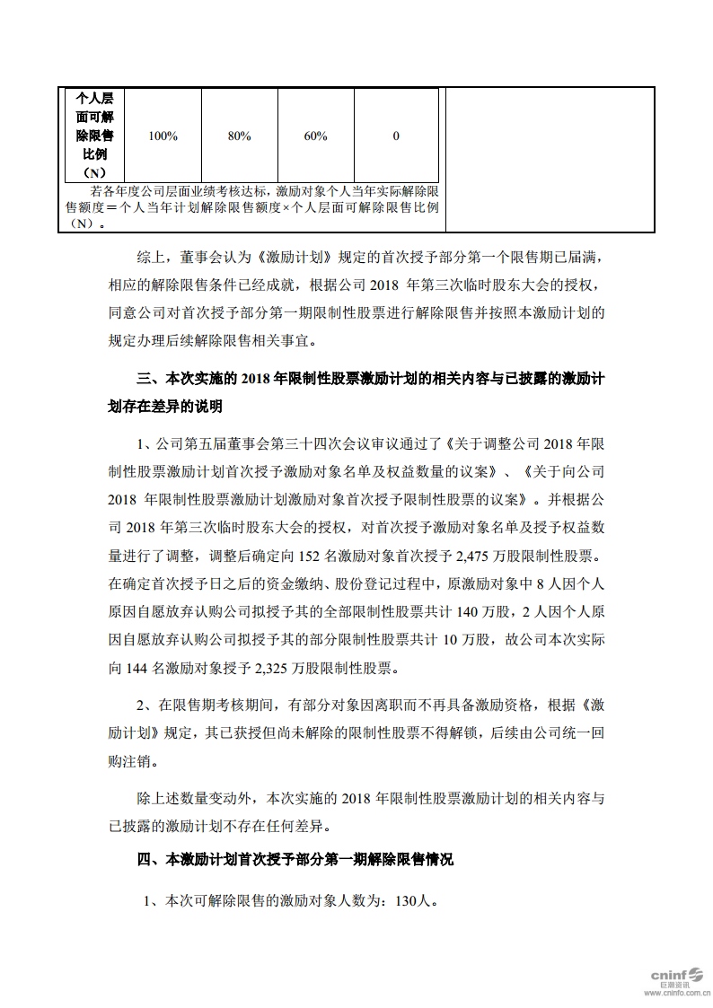 關(guān)于2018年限制性股票激勵(lì)計(jì)劃首次授予部分第一期解除限售條件成就的公告
