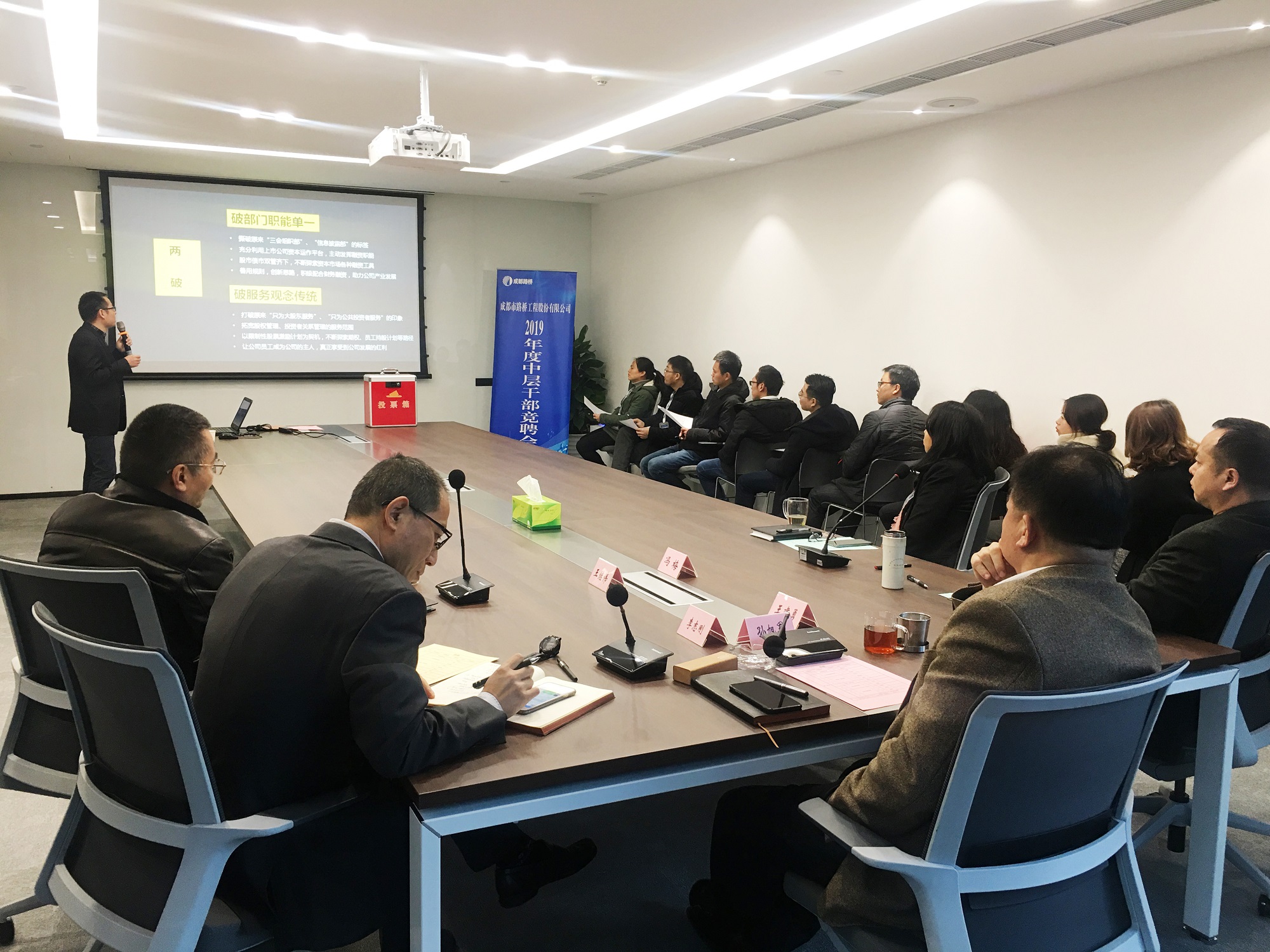 1月8日-11日,公司成功開(kāi)展了總部及直屬機(jī)構(gòu)、黨工團(tuán)序列中層管理崗位競(jìng)聘,來(lái)自公司總部11個(gè)部門(mén)、9個(gè)分子公司的共計(jì)63名優(yōu)秀干部員工在中海國(guó)際中心公司總部第六會(huì)議室針對(duì)27個(gè)中層管理崗位展開(kāi)激烈角逐。公司副董事長(zhǎng)、總經(jīng)理孫旭軍、常務(wù)副總經(jīng)理李志剛、監(jiān)事會(huì)主席王建勇、副總經(jīng)理王繼偉、副總經(jīng)理總經(jīng)濟(jì)師馮梅及20名經(jīng)隨機(jī)抽選產(chǎn)生的員工評(píng)委參與了1月11日競(jìng)聘會(huì)的最終投票。